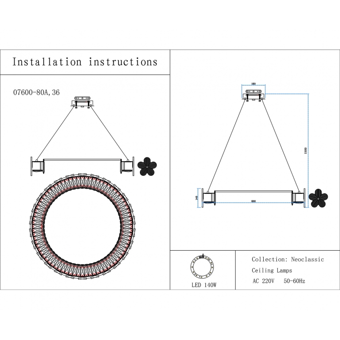 07600-80A,36 Люстра Лиона латунь d80 h150 Led 140W (3000K)