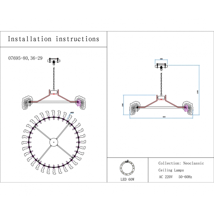 07695-80,36-29 Люстра Мару латунь/черный жемчуг d82 h150 Led 60W (3000K)