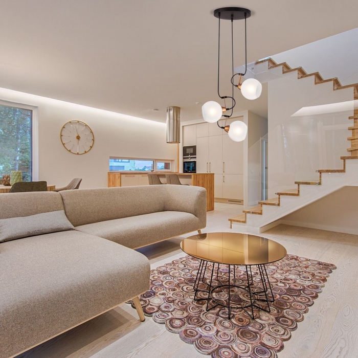 Гостиная, кухня, зал, гардеробная, спальня, коридор